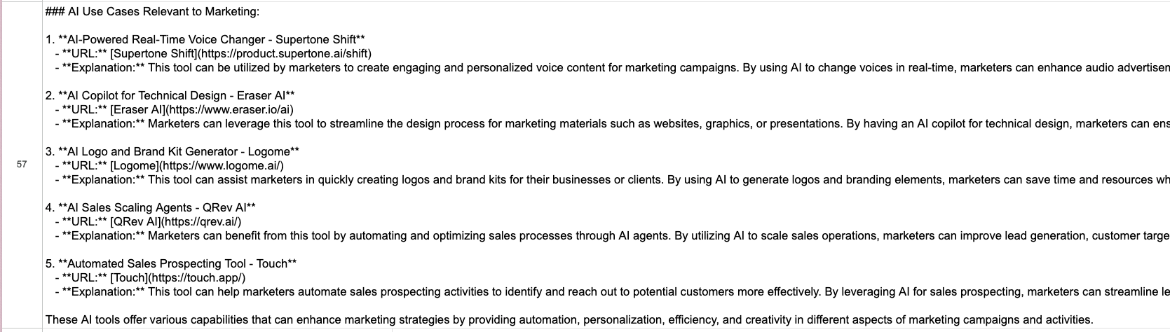 Voila! I got all the AI marketing use cases extracted and nicely summarized in Google Sheets.