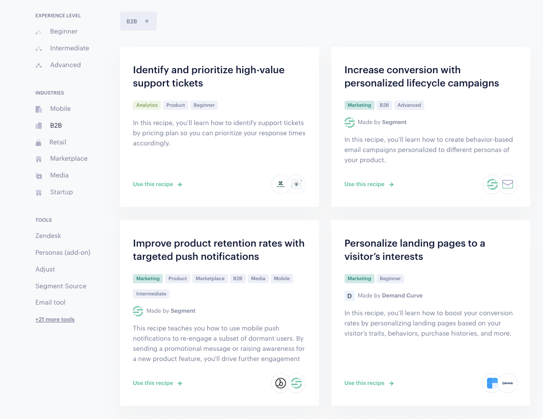 For each problem, Segment recipes provide a detailed solution for you to compare to your current one to build the business case.
